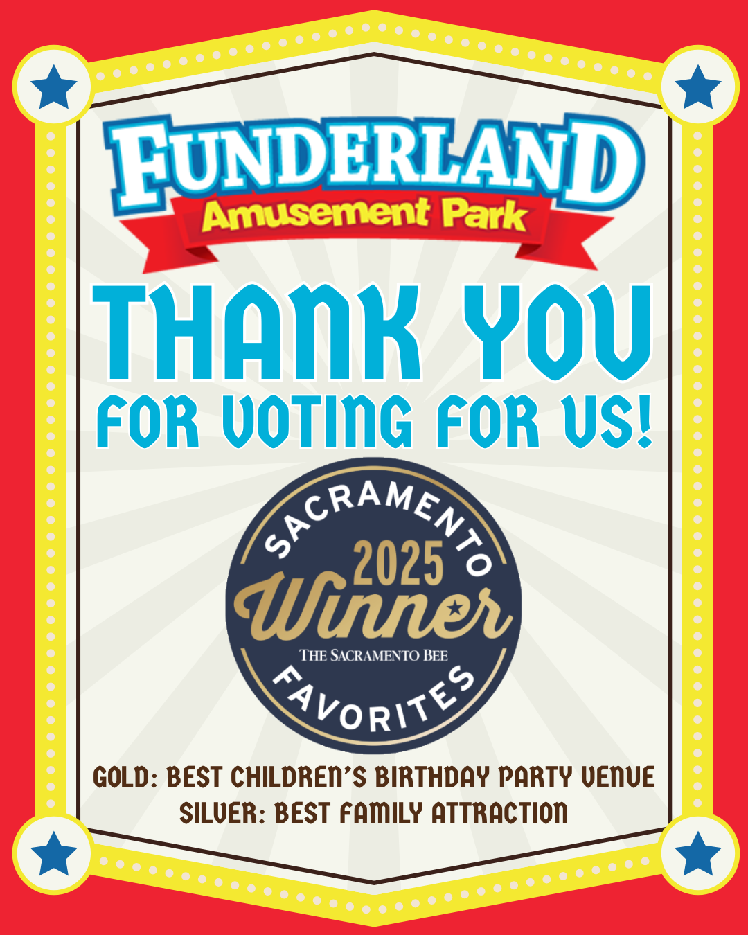 We are thrilled to announce that Funderland has been named a WINNER in the 2025 Sacramento Favorites contest, hosted by The Sacramento Bee! With a record-breaking 275,000+ votes cast by Sacramentans this year, it is truly an honor!